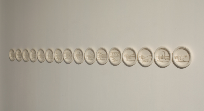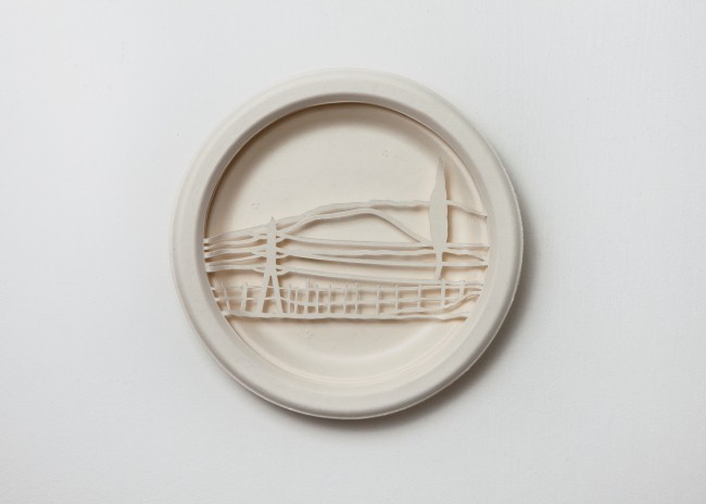 The series Global Landscape is made out of cut white paper plates – a kind of drawing through cutting – that leaves gentle silhouettes of changing landscapes; electric poles are planted within them, their shape reminiscent of thin human images. The whiteness of the images is emphasized by the shade they create in the background.