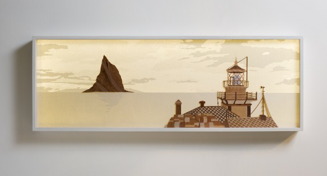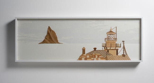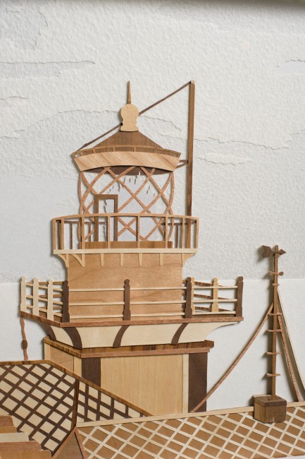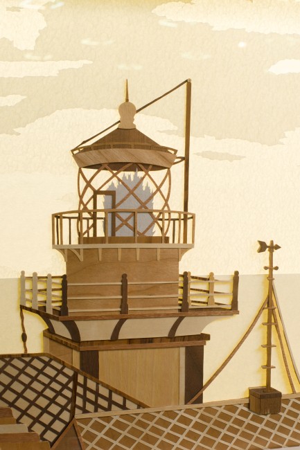 An imaginary landscape view that addresses the historic perils that accompanied the lives of lighthouse keepers: the danger of the lighthouse catching on fire, and warning sailors away from crashing into dry land.