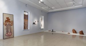 General View of the exhibition and Zen Garden Installation, 2016, plastic grains, paper, and various materials, 60x500x150 cm