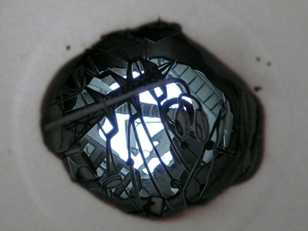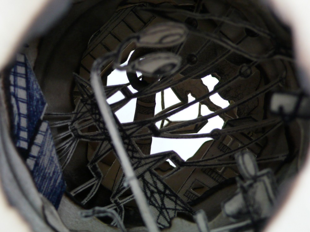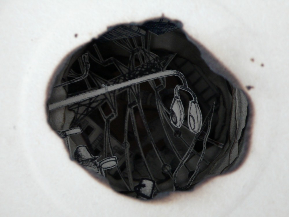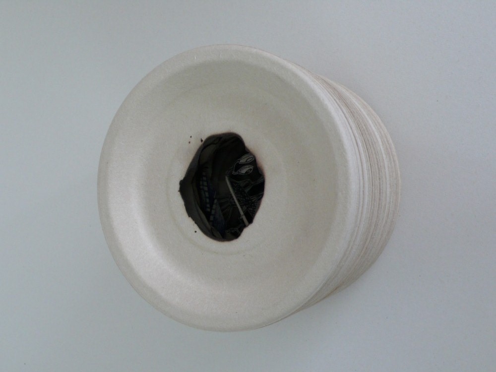 “Liat Livni’s Micro-City is made of a stack of paper plates which look like a ceramic vessel. She burned a circle inside the center of the plates and created what looks like the backdrop of a miniature city inside the recess, buried under the mound of plates, a poetic archaeology of a non-existent world”