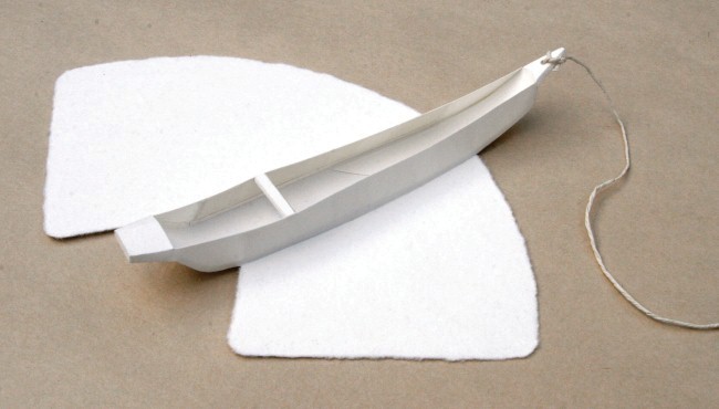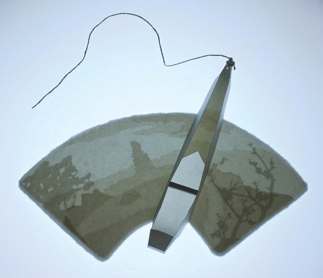 This piece was created using the traditional Japanese art of origami – paper folding – a single sheet of paper forms a boat sailing on a river of light; a light shining from below exposes a landscape heretofore unknown to the amazed spectator who is oblivious to its existence when the light is turned off.