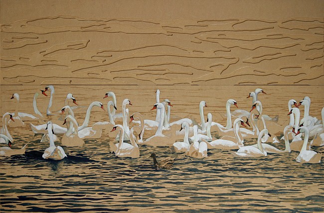 Painting of a flock of swans – one of them is black. The swans are not completely “finished” and their translucence lets spectators feel like they’re floating on water. The sky is etched above them in 3-D on MDF.
