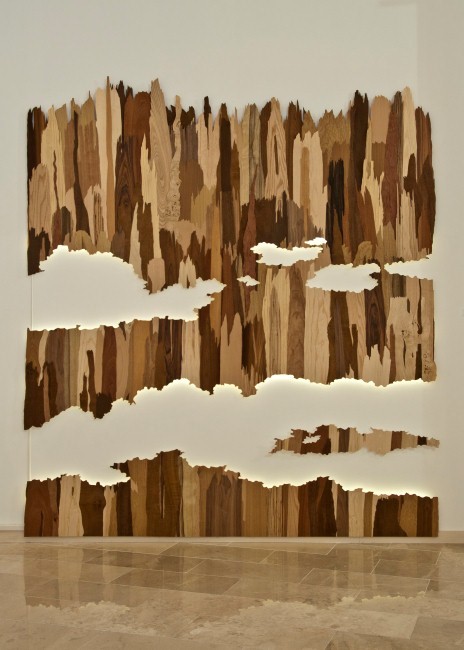 Veneer, wood and light / 2011 / 260 x 250 cm A wall piece creating ambiance through natural shades of wood and back-lighting, enhancing the contour of the clouds.