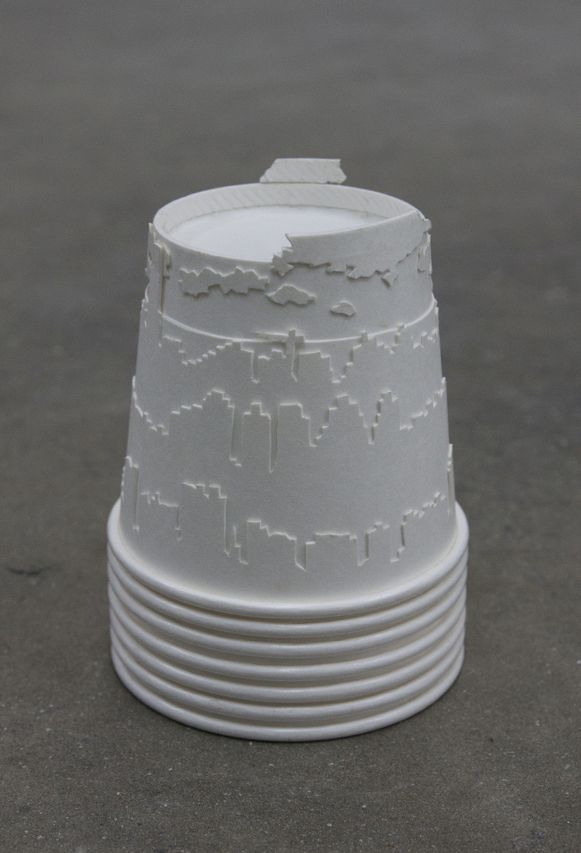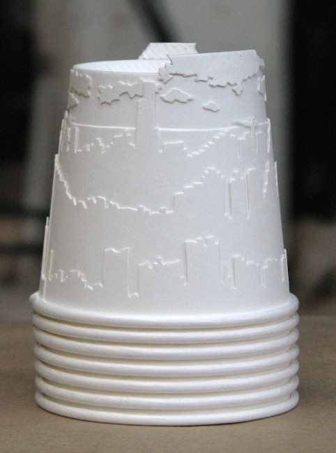 Paper cups 12 x 6 x 6 cm 2008 A stack of white cups generating an urban landscape of the Tel -Aviv area.